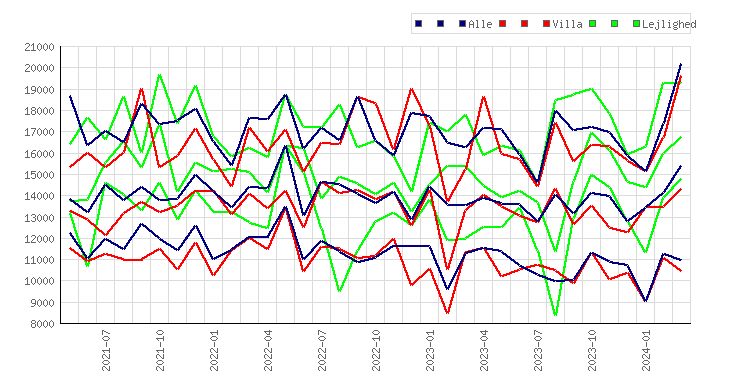 Der er 3 kurver for villaer og lejligheder, den nedre kvartil, medianen og den øvre kvartil.